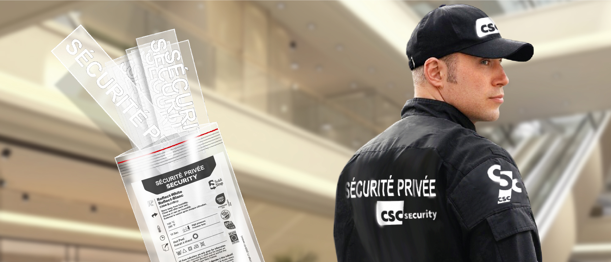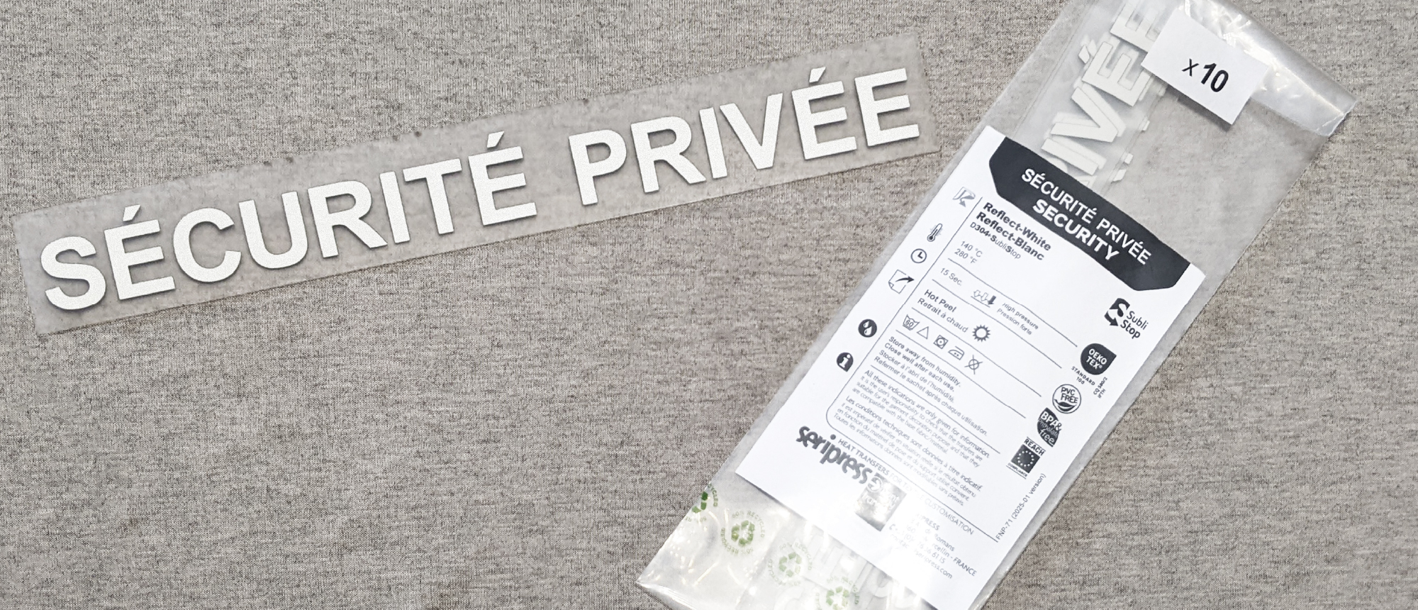 Équipez vos tenues de sécurité avec le marquage approprié grâce à notre sachet de 10 transferts Reflect blanc "SÉCURITÉ PRIVÉE", conformes à l’article R613-1 du Code de la Sécurité Intérieure, pour une utilisation réglementaire sur textiles noirs.