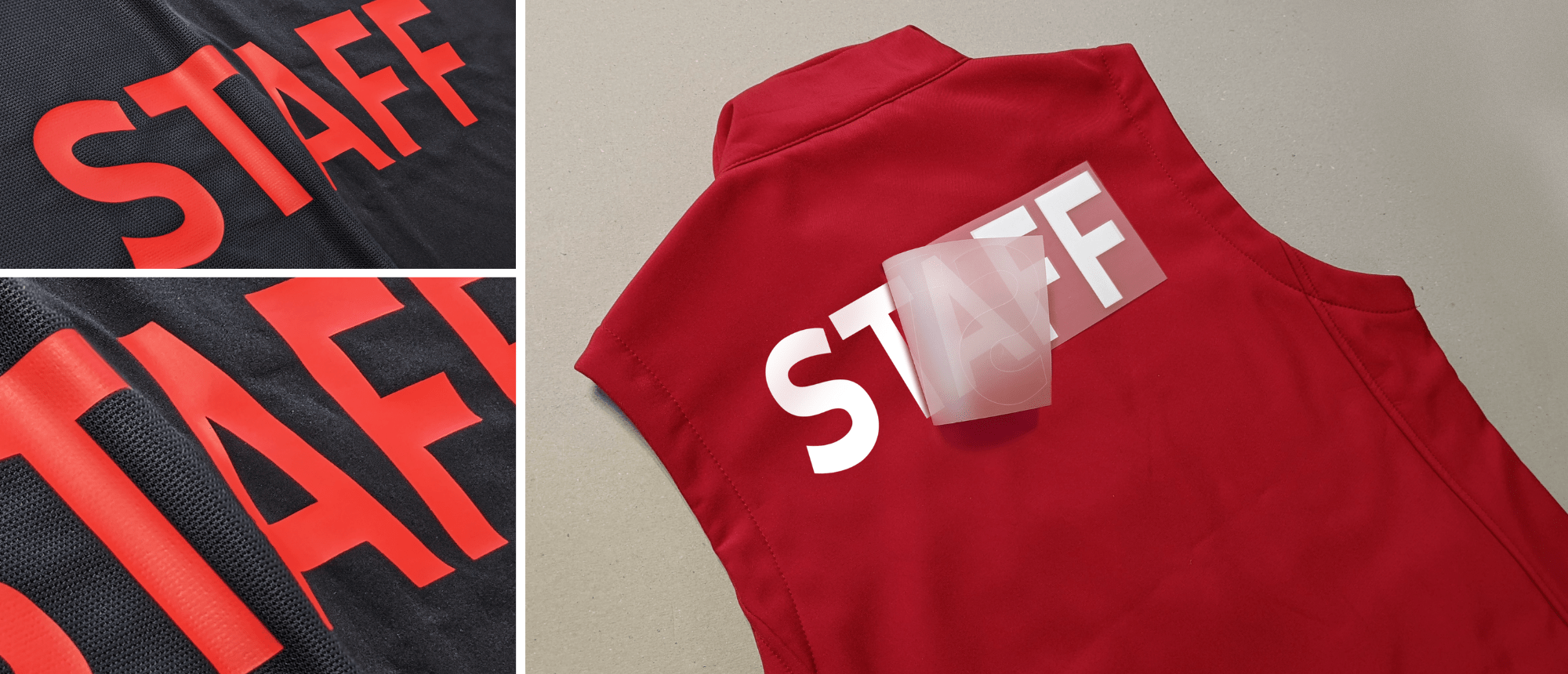 Grâce à une découpe laser de haute précision, le mot « STAFF » est formé en une seule pièce directement dans la matière. Aucun échenillage, aucune disposition à effectuer lettre par lettre : il suffit d’un seul coup de presse à chaud pour l’appliquer parfaitement sur le textile choisi.